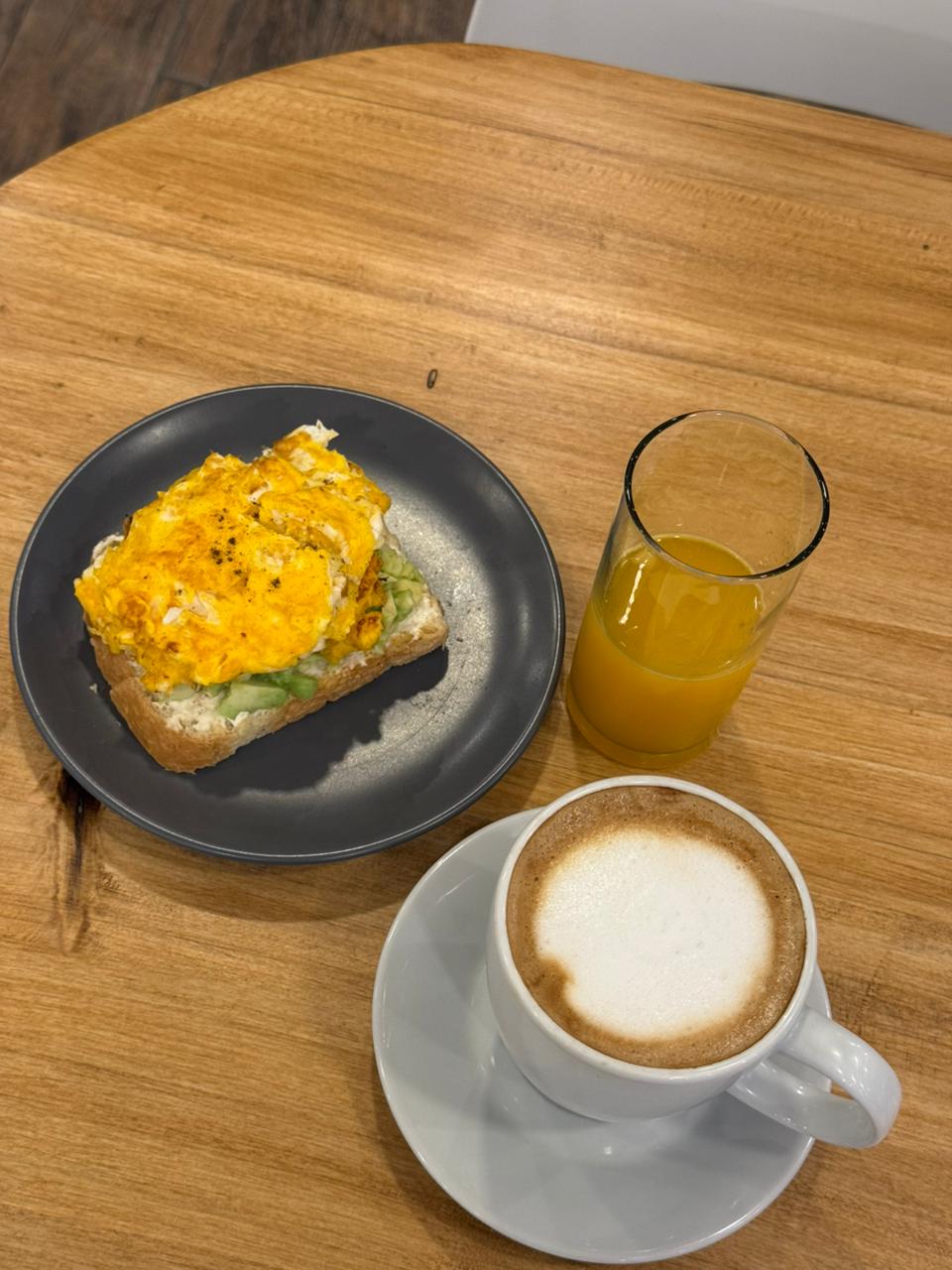 Café con leche, 3 medialunas, exprimido de naranja chico